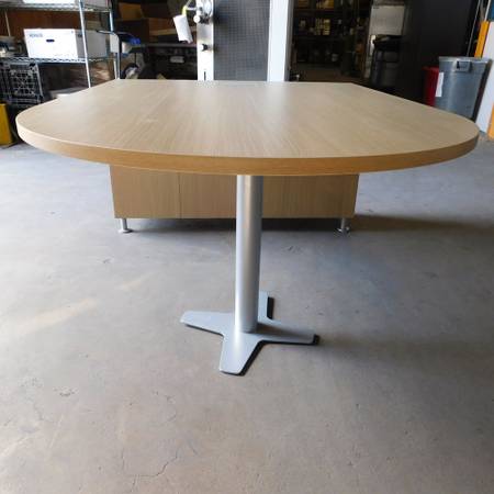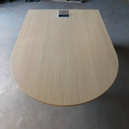 We have for sale a peninsula meeting table desk. The desk features 2 cubby shelves per side and a flip-up power port with (2) power outlets and (2) USB ports. The table measures 48 inches in width and 66 inches in length. The table is 28 inches high.