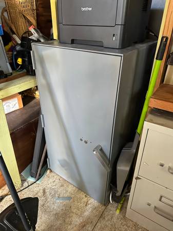 Measures 21" wide, 24" deep, 39" tall. Lots of space. Painted grey, in decent condition. It's 1/4 inch steel on the sides with a 1/2" inch steel door. Moveable shelves. It has a safe deposit box type key (which I have, and which works). Lock mechanism secures the top, bottom, and side.