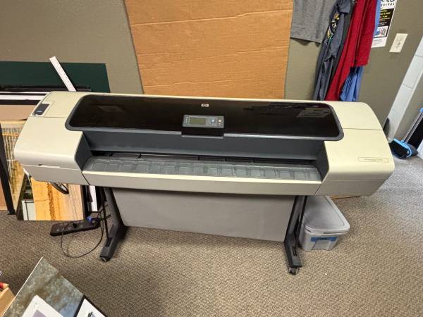 Selling this operational HP T1100 42” Plotter. We have owned it for seven years, so it is probably 10 years old. It needs servicing because the colors are changing from blue to purple. We had a new drive belt and a full service done on it a year ago. The problem is we don’t use it much and occasionally the ink dries and we have to send it in for service. That is the current situation. Right now it needs a photo black ink cartridge. Included as a photo of the last poster we printed which turned from blue to purple. If you know how to service it or can take it to a service center then it’s a cheap repair job and this printer will be reliable and print beautiful posters and signs. If you use it continually, then it probably won’t have these issues in the future.