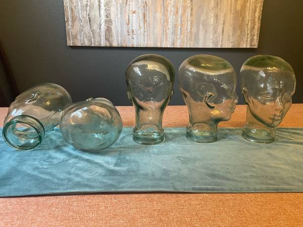 5 glass mannequin heads for sale. Would be good for retail or artistic applications that include hats, wigs, necklaces, etc. Asking $50 apiece OBO for intact items Asking $45 apiece OBO for items...