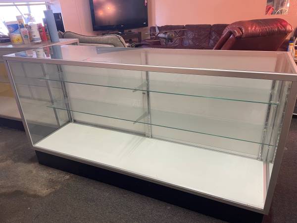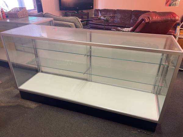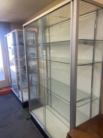 “Wide”: One, 38” x 72” by 20” display case. Similar cases go for $1581 new (for more details, see http://wayfair.com/home/pdp/fixturedisplays-aluminum-showcase-full-vison-70-inch-frame-shelf-retail-store-display-fxtu6605.html). Have sliding doors in the rear. Asking $200 OBO