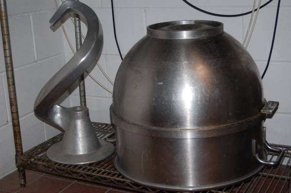 Comes with a 80 quart Bowl and dough Hook.
