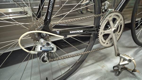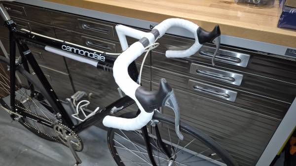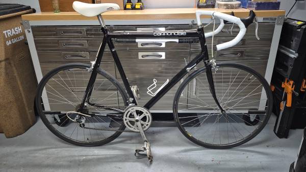 Very good condition Cannondale road bike with the original complete group of Shimano 105 components (headset, brakes, hubs, crank and derailers). Brand new tires (Continental Ultra Sport III), tubes (Continental Race 28), brake shoes (Shimano), tape (duplicated original), and brake lever hoods. Road ready for your next ride or would make an equally nice display piece. Note the original toe clips if you're interested in giving it a spin before purchase and wear appropriate shoes.