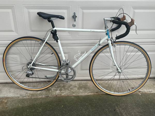 This Raliegh Technium bike has been kept in a storage unit for many years, never kept outdoors. It looks very nice considering it's age. Recently acquired and updated with new rim strips, tubes, and tires. Front and rear wheel bearings cleaned and repacked with Phil's waterproof grease. Front and rear brakes re-adjusted. Shifts perfectly and rolls like your skating on glass, it's so smooth when you are riding it. Crank to seat post is 55cm. Crank to top tube is 52 cm. Stand over height - floor to top tube is 32" or 81 cm. It has Sun Tour rims, Sun Tour shifters, LePree front and rear derailleurs, 2 front sprockets, and 6 sprockets on the rear cassette.