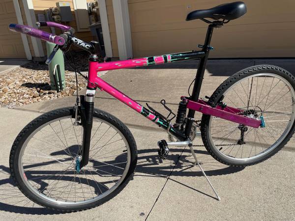 For sale is this 1993 Trek 9200 soft tail mountain bike. Frame size is 21". Seat tube-21"(c-t); top tube-22.5"(c-c). Fits a 6'0"-6'2" rider. The frame is made of Easton EA70 ProGram DB aluminum and has custom paint in the front triangle (previous owner) and the original Electric Plum in the rear swingarms. Frame has been cleaned/detailed. Does have some scratches and paint chip touchups. No dents. The fork is a Manitou Pro (I think). Still smooth and in good condition with a rattle can Black finish (also previous owner).