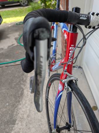 Here's a classic. I got this bike quite a few years ago, it was always a smidge too tall but incredibly fast. The ride is stiff but compliant, it accelerates extremely quickly, and handles very well at speed. Because my riding style changed to more offroad and it was always slightly too tall for me, I hung it in my garage for some years and haven't ridden it, so its finally time to let it go.