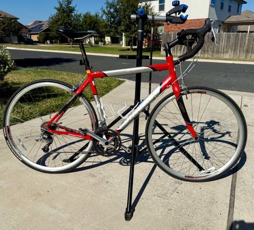 I’m including: 2 pairs Mens size 10/11 riding shoes (Specialized / Bontrager)with cleats to match pedals, an “IKEA style” wooden cycle storage rack and a set of new Michelin racing tires. Willing to deliver within 15 miles of Jarrell.