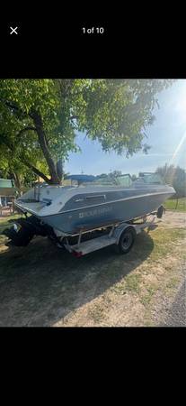 20ft gas boat has 235 horsepower comes with life jackets new battery new starter just put as well clean title and comes with trailer and has brand new tires on trailer and spare new and comes with a boat cover fiber glass boat no cracks no leaks all is great no oil leaks or no engine leaks or sounds runs and sounds great you will need a 2 inch ball to pull it paint is okay it is a 1989 but runs real hard asking $2600 cash up to date registration and sticker and clean title everything works like it needs to it's lake ready!