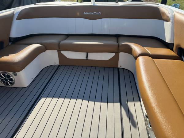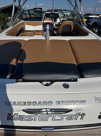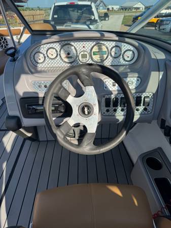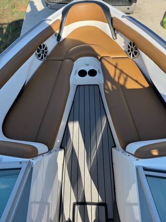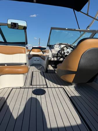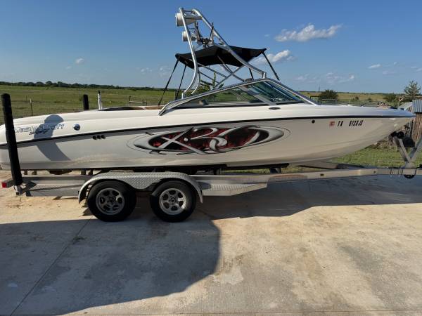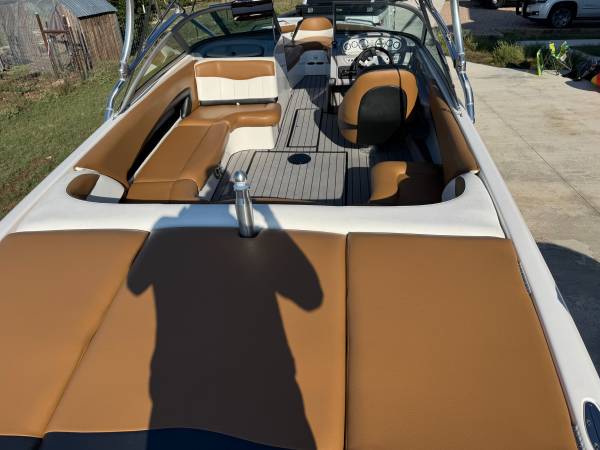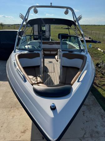This boat is very clean! Selling because we are just not using it nearly as much as we thought we would. I have only put 30 hours on it in the two seasons I have owned it. However, we did put a lot into updating this boat. The boat has a new engine in it with only 45 hours on it. The original transmission has about 300 hours on it so for a 2002, it has barely been used. The gel coat is in excellent shape (pictures don't do it justice) aside from a few spots on the decals that have peeled up. We completely replaced the interior for a more modern look with upgraded vinyl. We also gutted the carpet and replaced it with sea dek flooring. The stereo was upgraded from stock with Kicker Audio speakers, tower speakers, sub, and amps. All maintenance has been done for the season already. The ballast impellers were replaced and the oil was changed at the beginning of summer and we only put 20 hours on the boat this season. 1 of 2 batteries was replaced in July and the bimini was replaced by the previous owner before I bought it and is in great shape (not faded, no holes, etc.) The boat will also come with a lightweight Horizon aluminum trailer.