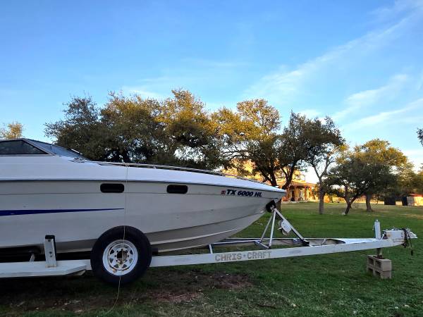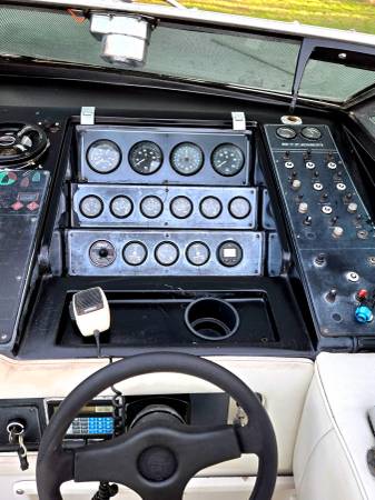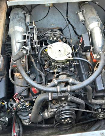 It comes with a Chris Craft trailer, a large rear bench seat, swim platform, and the large sun bed over the two Motors. Can easily fire up the motors so you can hear them run. Or can send you a video of them running. Leather is in pretty good condition with the light and dark blue interior pattern. The V birth upholstery is in decent condition. It is missing one of two cushions that cover the motors and the bottom section of the front left seat.