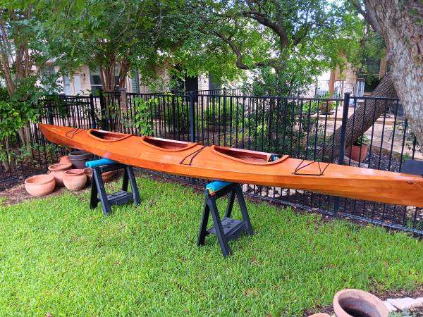 This 20-foot-long triple tandem is set up for two paddlers, with the middle cockpit used as cargo hold. Spacious, comfortable and seaworthy, it's ready for any long expedition.