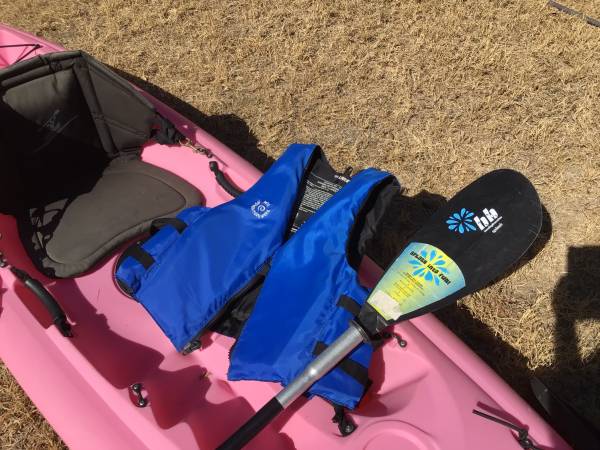 Ocean Venus sit on top 11ft kayak in great condition. Venus's were designed by women for women although I am a man and love this design so much I own 4 of them. It is 28” wide, sturdy and doesn’t flip easily, rides low and easy to get into. It’s rated for 225 lbs. Bought at Austin Kayak for $850 plus $70 in tax, $920 just for the kayak, no paddles or life jacket. Molded valuable foot rests, 5 handles, ends, sides and center, bungees are new, comes with a new blue adjustable Livery life jacket, a Bending Branch Splash paddle and paddle keeper, a 4 point ocean kayak seat, a large 14” x 19” back cargo area for a milk crate, ice chest, small child or dog, whatever you want to carry. Also a 6”round screw on lid compartment before seat area, and an over 8” x 15” front inside hatch with lid that is most handy to carry the life jacket, paddle to be all self contained. Not water proof but water resistant. I put emergency stuff like rope, and extra paddle, first aid kit and more. I would also put a lunch kit in after I removed the jacket and paddle, strap the jacket on top “ handy to reach” and my dog would lay or sit on it. Cooler would be on back in cargo area with fishing box so I could reach them. This is great for overnight trips, all day or just a few hours. Tracks well and not heavy with drain hole plug in the front.