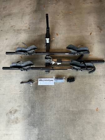 For Sale – Used Thule 990XT Doubletrack Hitch Mounted Bike Rack in good condition. It is a 2-bike platform hitch rack that applies pressure to the bike frames via a center mast, offering versatility for various bike types and a fold-up design for parking clearance. It has a compatible adapter for 1.25" or 2" hitches. Asking $165.00.