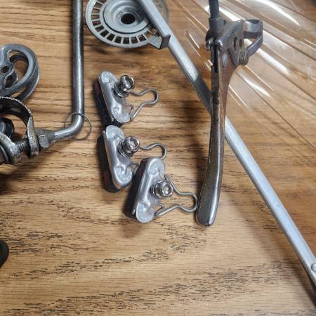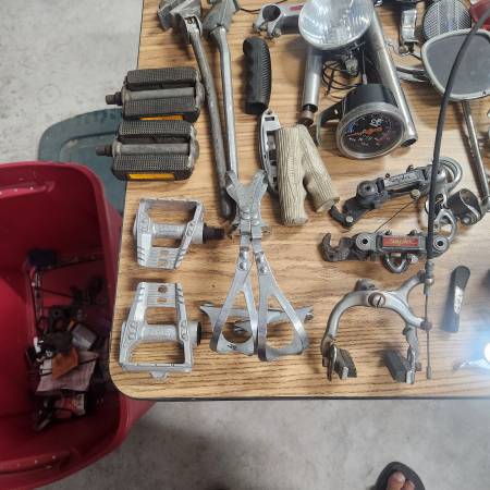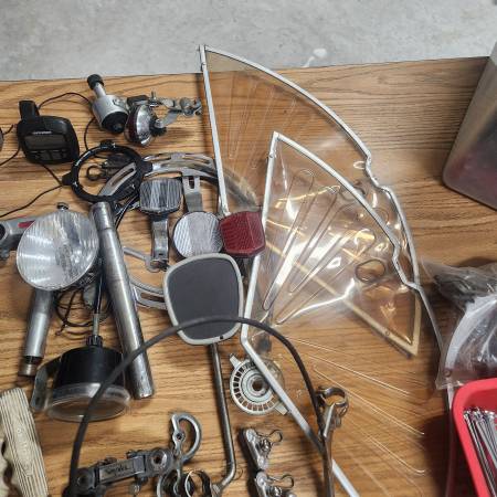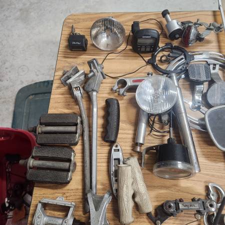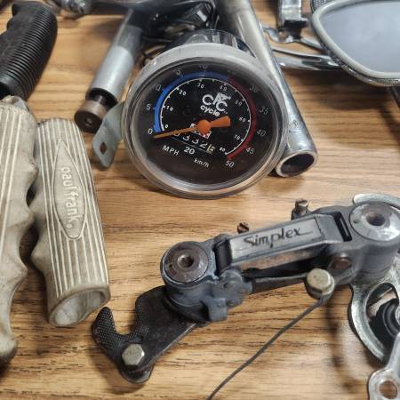 Lots of different bike parts. Simplex. 3 speed. Derailers. Headlights. Speedometer. Make me an offer for all.