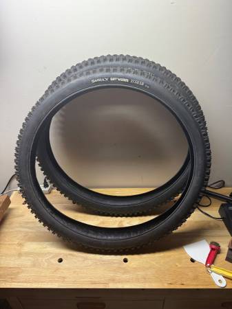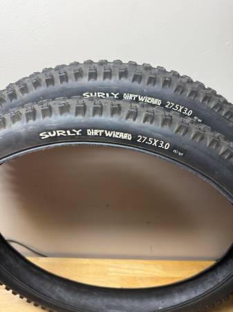 For Sale is a pair of Surly Dirt Wizard 27.5 x 3.00 tires that came off of my Karate Monkey. They only have around 10 miles on them before they were removed. If you look, you can still see the whiskers on the treads. Never mounted tubeless so there is no sealant at all