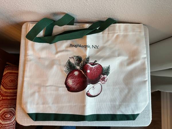 NEW in package, Poughkeepsie Canvas Tote Bag measures 18" across, 13.5" tall. Poly/Cotton blend.