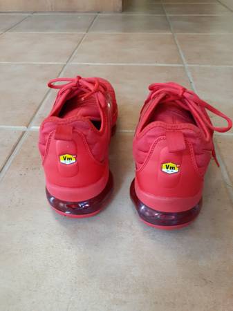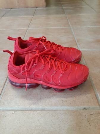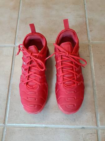 Size 10 Air VaporMax Plus Triple Red Nike Sneakers CW6973-600 They're clean and in good condition, with some wear, including scuffs along the sole edge, and a small tear in mesh toe at the front...