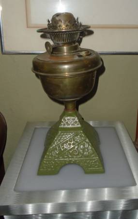 Fine Antique brass oil lamp. Victorian Era, Circa 1870. Green metal base. Fabulous glass globe shade. Very ornate, highly detailed and heavy. The base stands 14 inches tall. A rare and beautiful...