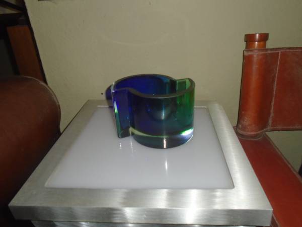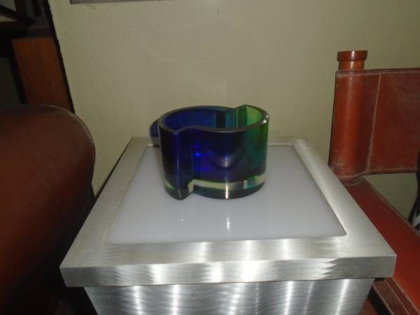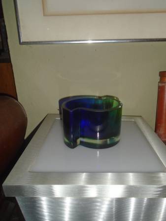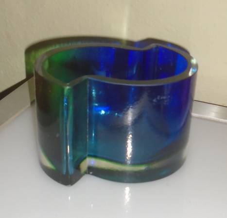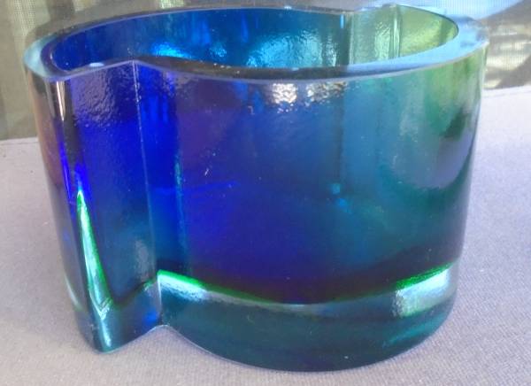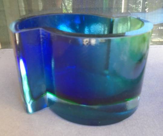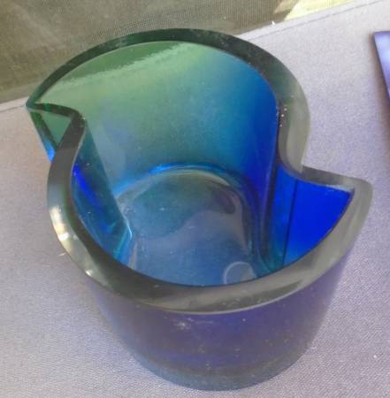 Stunning Vintage Bohemian Art Glass Bowl or Vase -Substantial and heavy glass bowl -Midcentury modern in design -wonderful cobalt blue with one green corner. Bold and beautiful piece of glass.