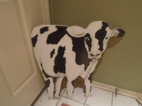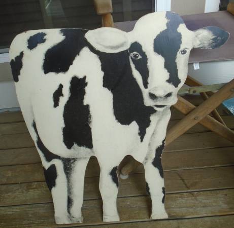 **100-cash-firm** This painted cow was bought at Scarbroughs Highland Mall in 1987, still has part of the orig. tag on the back. A nice painted wood cow by artist, Katherine Revoir (Mill Valley, CA) Entitled, "BABY". Some nicks/dings. The paint still looks great. Stands 24 inches tall, 23 inches left to right. Great piece! $100.