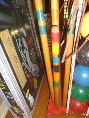 A complete 6-piece vintage croquet set by South Bend (Indiana). This should be a display piece. The mallets have chips in various degrees. Three are still useable. 5 of the 6 balls are useable, (red ball is chipped). The two post are good. Wickets are rusted. The wooden/metal carrier is fine, though some rust. South bend sticker remains. Overall, a nice complete vintage set for display only. Please review pictures for details.