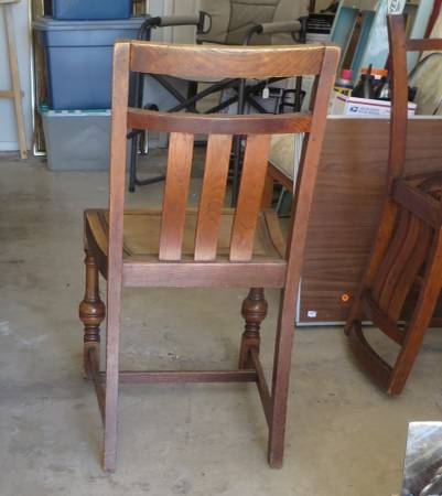 We found these 4 chairs on sale in a new business and have decided not to keep them. They measure 34 in. tall, and the seat is 18 in. from the floor and have a nice finish. The seat is an insert and can be removed to upholster, as it has been previously (staple holes underneath). The area of the seat is 16 x 18 inches. (Nice 2-button detail). Pick up at 508 Hoot Owl Lane, So., Leander, TX 78641. Offers considered.