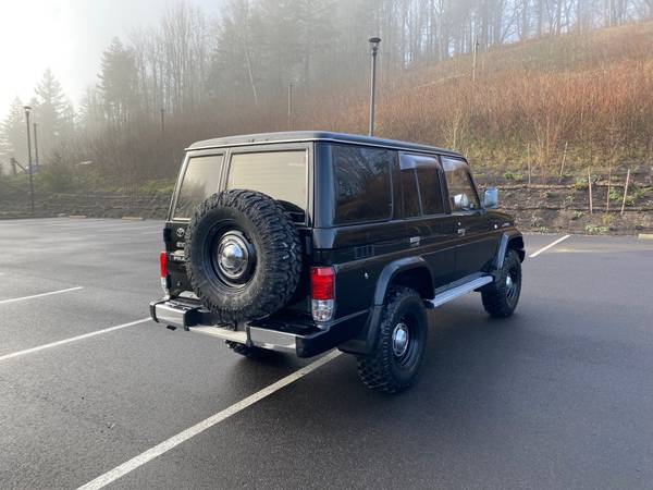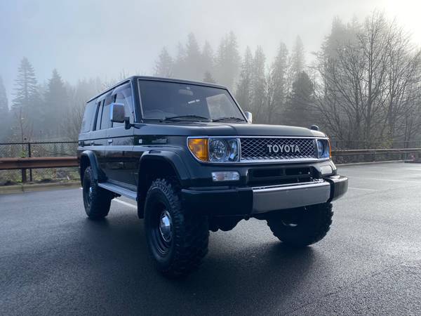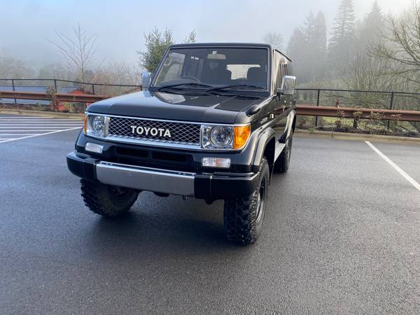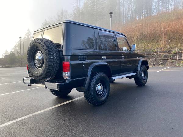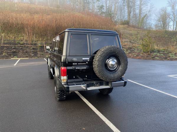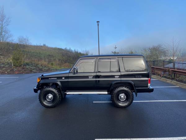 This 1995 Toyota Land Cruiser KZJ78 Prado is right-hand drive that was built in January 1995. Finished in black with a full repaint and blue cloth interior, the truck is powered by a 3.0-liter turbodiesel inline-four paired with a four-speed automatic transmission and a two-speed transfer case. Features include 16” Dean aluminum FJ40 inspired wheels, 2” Rancho lift and 33” mud tires. Recent work carried out by seller consists of an oil change along with a fuel filter, and air filter. This 70-Series Prado shows 179k kilometers (~108k miles) and is now offered with Oregon title.