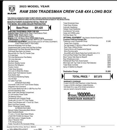 2023 RAM 2500 Tradesman Crew Cab Long Bed 4x4 Pickup with 118,950 miles. 6.4L V8 Gas engine with an 8-speed automatic transmission. 4WD. 8ft Long Bed. 10,000 GVW. Manual shift on the fly transfer...