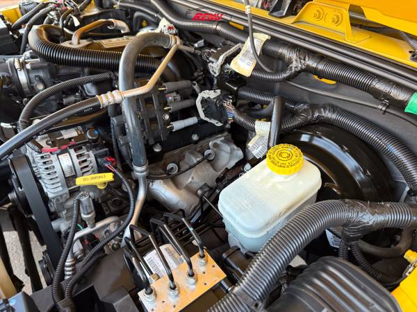 The car is finished in the optional Detonator Yellow and features Halogen headlights, fog lights, removable soft top, and full size spare tire.