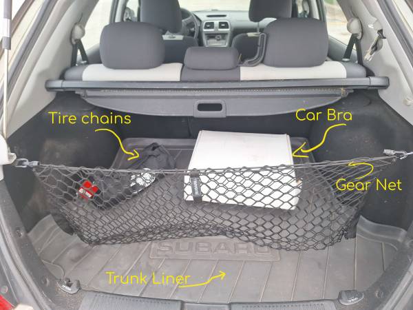 - Extras: A car bra (useful for road trips, only used once and in like new condition), Tire chains (never used, just kept for legal requirement in some mountain areas), Bluetooth stereo & cubby.