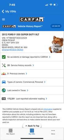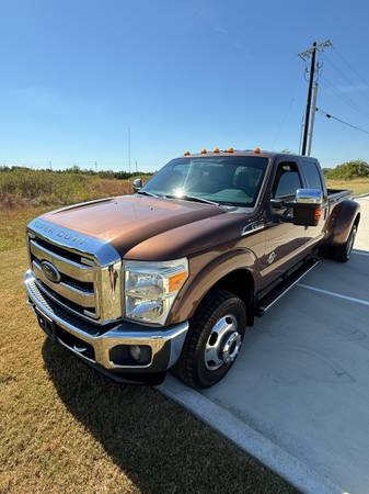 2012 Ford F350 Super Duty 6.7 Diesel 4x4 that is in perfect condition inside and out. This truck is completely problem free, not a single issue at all, it runs and drives perfect. It has 171k original miles on it. I have a spotless car fax to back it up, and it also shows it has never been in a single accident since it was new. The truck has been perfectly maintained and well taken care of. It has the fifth wheel attachment in the bed, trailer towing package, dual rear wheel, 4x4, power seat, large screen in the dash, power windows, power locks, power telescopic mirrors, and also power folding as well, cruise, tilt, cd player, and more. It you are looking for a completely problem free truck this is it. I will be happy to share the car fax, just ask. The tires are in perfect shape all the way around, this truck drives as smooth as can be you will be amazed. It is a clean Texas title.
