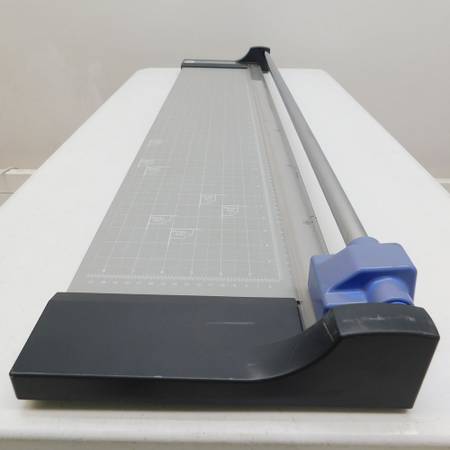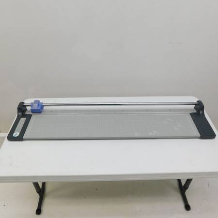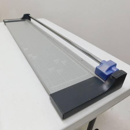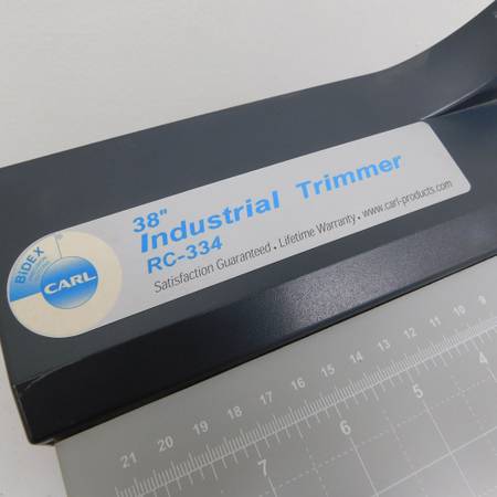 We have a Carl Bidex industrial rotary paper trimmer, model RC-334, for sale. The trimmer is in great condition and can trim up to 38 inches of paper. Its overall dimensions are 44.25" wide x 10" deep. The rotary wheel slides normally and trims the paper as intended.