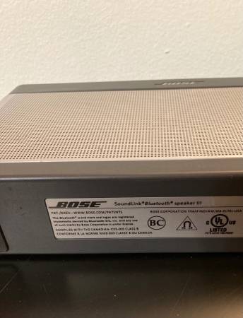 I have a lightly used Bose Soundlink III Bluetooth Speaker + power supply for sale. Tested and it works/sounds great. I used both the Bluetooth and the Aux. functions. The battery holds a charge as well. Music played through this has a deep rich bass sound. Come by and check it out.
