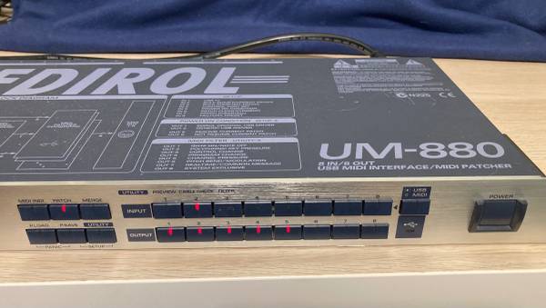 For sale a gently used Edirol UM880 Eight-in/Eight-out USB MIDI Interface. Good condition. It powers on, but is not tested beyond that. You are more than welcome to fully test out, just bring some Midi cables/devices.