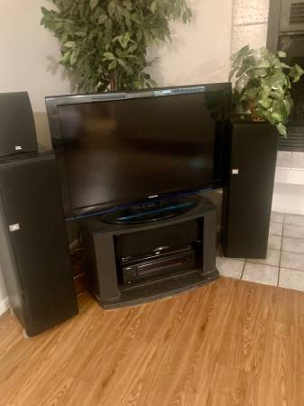 40 inch flat screen Entertainment center with stand Blu-ray DVD Stereo receiver Remotes Free speakers!!!!