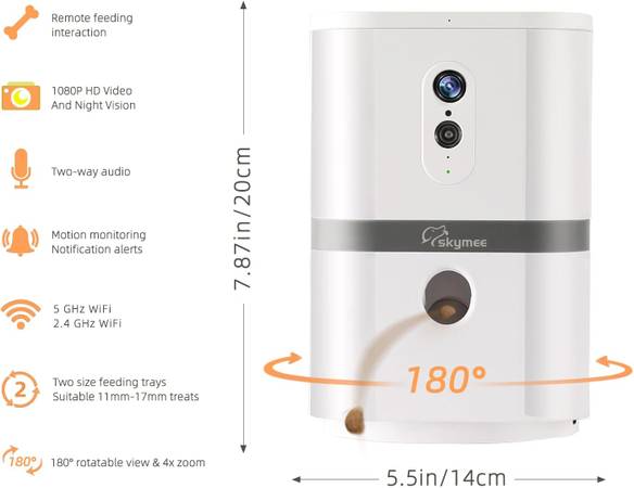 - Enjoying happy catch game with your pet by tossing his favorite treats (recommend size 0.6cm~1.1cm) via Skymee free app and exercise your pet. You can Remotely release pets favorite snacks and play a game with your pets, avoid your love pets getting bored.