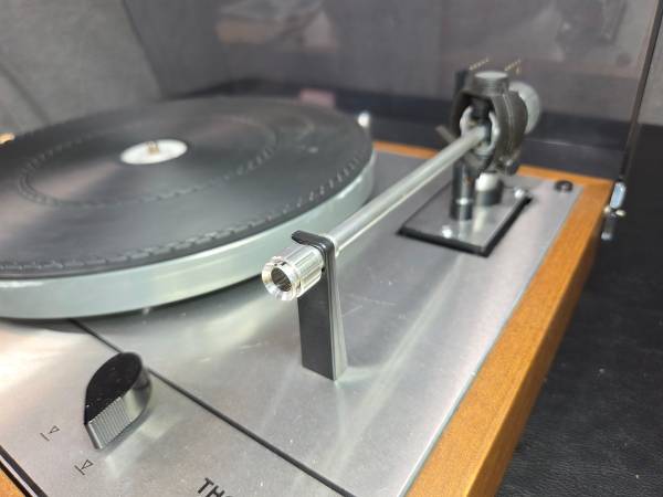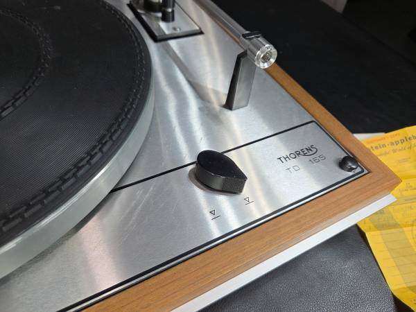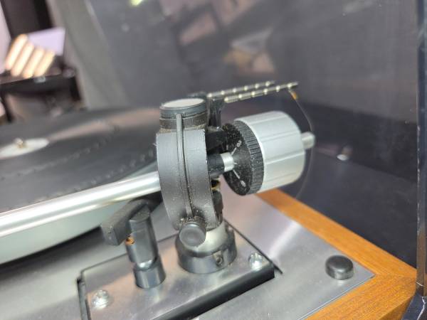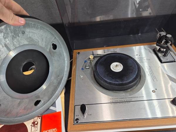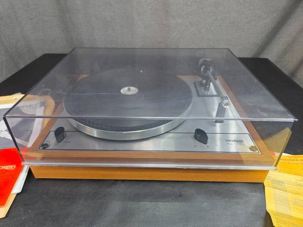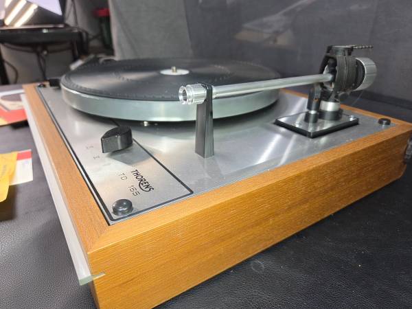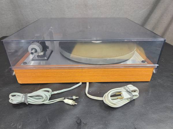 This turntable is in good cosmetic condition and it spins but I haven't tested it any further. I don't have a headshell for it. The belt might not be the correct one, when you flip it from 33rpm to 45 it doesn't engage properly and it's not holding speed. It seems that the queuing action is working as it should. There are light scratches on the metal plate between the tone arm and the platter. The dust cover is in good condition with only light scratches and some of the lines are from a cord that sat on it and "melted" into it. Also included is the original manual and sales receipt from 1976. Feel free to reach out with any questions. see pics and I can send a video demo of it in action.