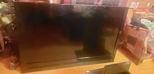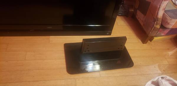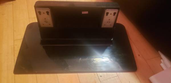 Has small stand. Black shiny stand has scratches. TV can also be mounted on the wall.