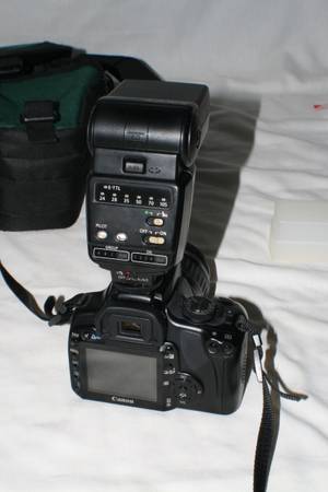 Comes complete with a 18-55mm Zoom AF Lens, cap, battery, charger, flash card, Upload cable, Speedlite 420 EX Flash, camera bag, and cleaning kit.