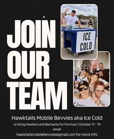 Event workers needed! Seeking smart, fun, hard-working folks to sell drinks at Formula 1 at Circuit of the Americas October 17-19. This is our fourth year providing this service at the race, and this year we're expanding so we need a lot more people. No experience needed--many of our most successful hawkers are teachers, comedians, and college students. If you can move product around, talk to people, and work a phone (our point of sale machines are like phones), you can hawk. People typically work 1-3 days, 12 hours a day (this includes getting onsite). Our average income this year (from Nascar and Moto GP) is about $30/hour. We work hard but we have fun and make great money. Please note we are outside all day.