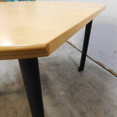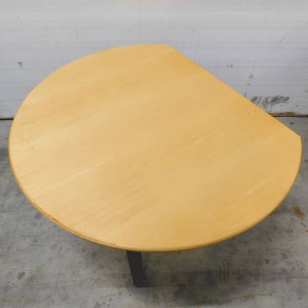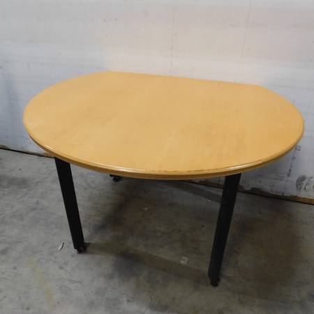 We have for sale 3-quarter round mobile task tables. The table top is solid wood and measures 4-feet in diameter. The table measures 40-inches from the front curved edge to the straight edge. The legs are powder coated aluminium with swivel casters. The legs are removable from the quarter round table top.