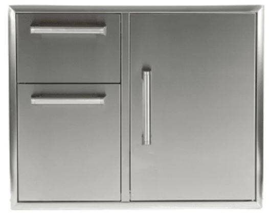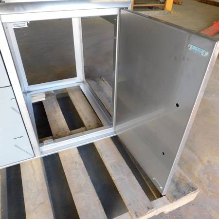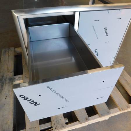 We have a Coyote grill outdoor stainless steel cabinet drawer combo. The cabinet is in excellent condition and has never been installed or used. The cabinet features a storage space on the right and two drawers on rollers on the left side. The front features a beveled trim measuring 30 inches wide x 24 inches high. The storage body of the cabinet measures 26.5 inches wide x 20-3/8 inch high x 20 inched deep. The handles for the door and drawers are not included.