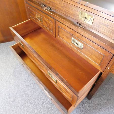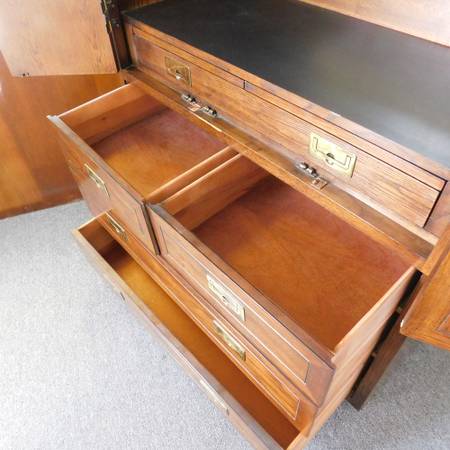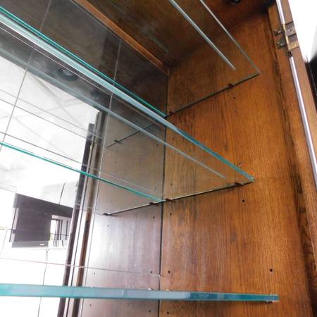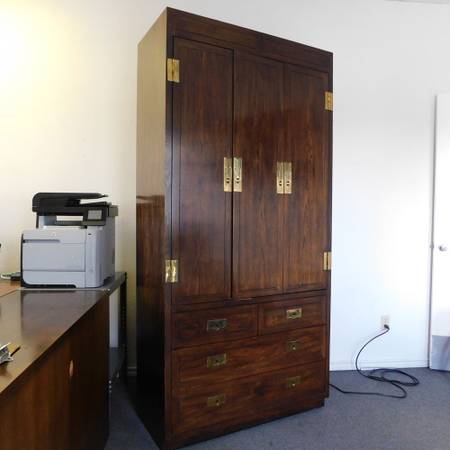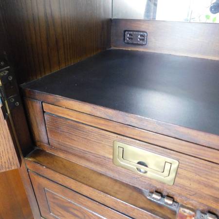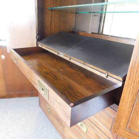 We have a Henredon Scene One Campaign Armoire Liquor Cabinet for sale. The cabinet is in excellent condition and features a lighted glass shelf display, a back wall mirror, a pull-out bar with under-storage, and four drawers for storage. The cabinet includes a power outlet on the interior of the lighted bar. The lights are dimmable. The cabinet measures 40" Wide x 18" Deep x 82" H.