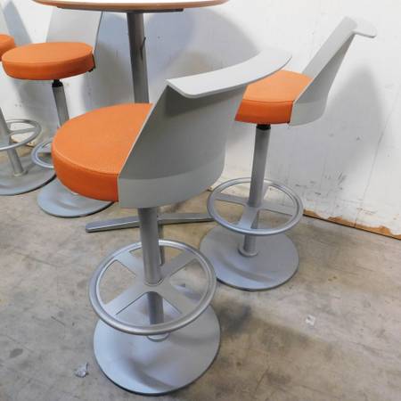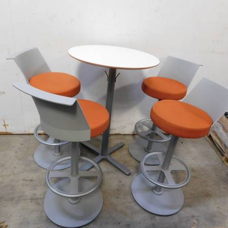 We have an Ikea Billsta bar height round table with (4) Hon Flock Series swivel stools for sale. The table and stools are in excellent condition. The stools self-center back to the original position.