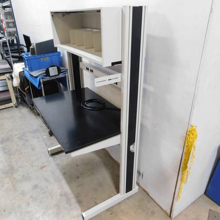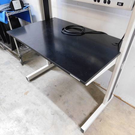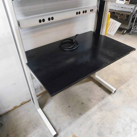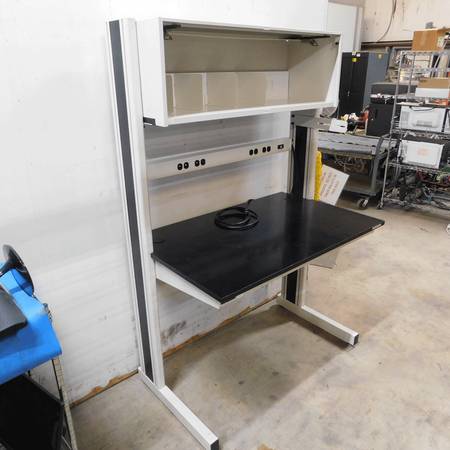 We have for sale a Kewaunee Evolution black epoxy resin top workbench. The workstation comes with a power strip and a shelf organizer on top. The epoxy resin top measures 48-inches wide x 30-inches deep. There is a small crack in the plastic trim on the right side of the column as seen in the picture and no cover door for the shelf organizer. Otherwise, the workbench is in excellent condition.