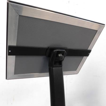 (Lot of 3) Curved black steel pedestal sign holder for 8-1/2" x 11" signage. Excellent sleek sign holders for galleries, lobbies, and cafés. the fram edges flip open for quick access. the frames rotate from portrait to landscape position and a non-glare plastic cover protects signs and posters. The height of each sign is 48 inches high.