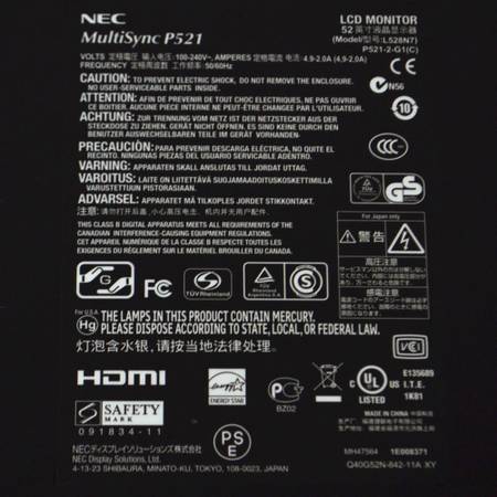 We have an NEC MultiSync P521 52" Commercial-Grade Large Format Display Monitor for sale with No Stand or Remote. It has a resolution of 1920 x 1080 and a Pixel Pitch of 0.6 x 0.6 mm. It comes with (1) DisplayPort, (1) HDMI, (1) DVI-D, (1) VGA, and (5) BNC Component Composite video ports. There is a small scratch on the top right side of the display, as seen in Image 3, and the "Power On" button is damaged but still works.