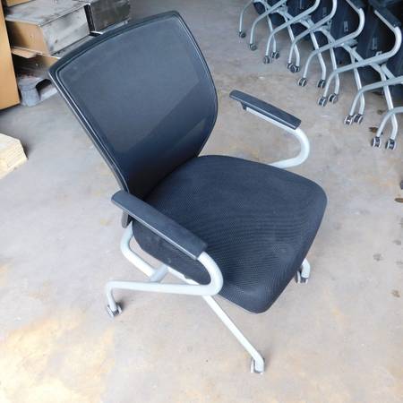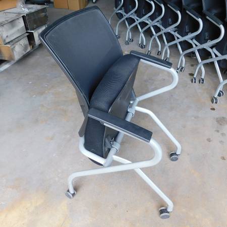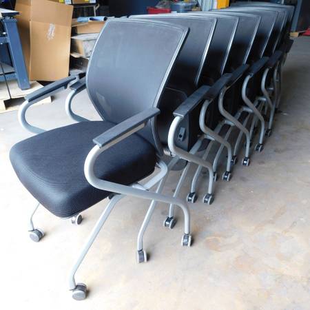 We have for sale rolling office chairs that nest together. The chairs are in good condition and the wheels roll smoothly. The chairs feature a mesh back and a cushioned seat that flips up to nest the chairs together for storage. There are (11) chairs total.