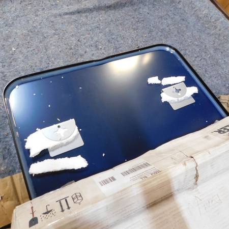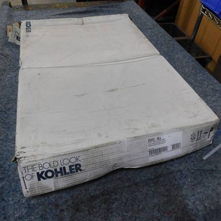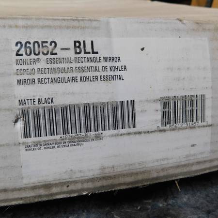 New in Box Kohler 26052-BLL Essential Rectangle Mirror with matte black frame. The box was opened up to get pictures of the new mirror. The glass has a protective film on it. The mirror has a small dent around the top edge but is only noticeable from the back of the mirror. The mirror measures 22" x 34" and includes mounting brackets for portrait or landscape hanging position. Installation hardware is included. This mirror retails for $250 from Kohler.