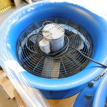 Used Patterson 22" High Velocity Drum Fans for sale. Powder coated steel shell with aluminum blades. All tested and working. The fans have a 100 foot air throw excellent for warehouse air circulation and cooling. The fans include three chains each for hanging. Also available are high impact polypropylene shell fans and smaller diameter sizes.